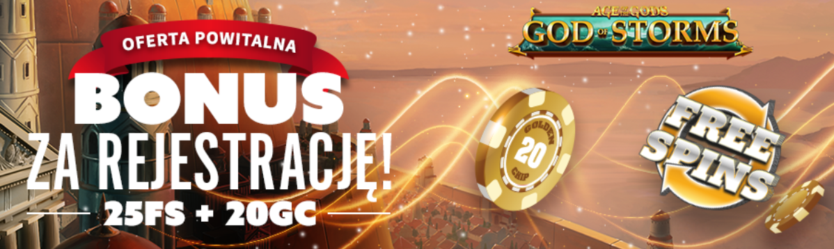 Promocje kasynowe, w których są darmowe spiny, rzadko można spotkać. Jednak znaleźliśmy taką platformę z darmowymi spinami, która oferuje świetny bonus za rejestracje. Total Casino zachęca wszystkich do dołączenia. Wystarczy zrobić kilka łatwych kroków aby uzyskać bonus, mianowicie aktywować swoje konto i następnie wybrać bonus 25 darmowych spinów i 20 Golden Chip. Najpierw aktywuj bonus, który Ci bardziej pasuje, a kolejny możesz zaakceptować po wykorzystaniu pierwszego. Jednak darmowe free spiny można wykorzystać tylko w określonej grze: Age of the Gods: God of Storms. Nie ma co się martwić, ponieważ jest to atrakcyjna gra. Bonus w postaci 20 Golden Chip można wykorzystać w dowolnej grze stołowej.